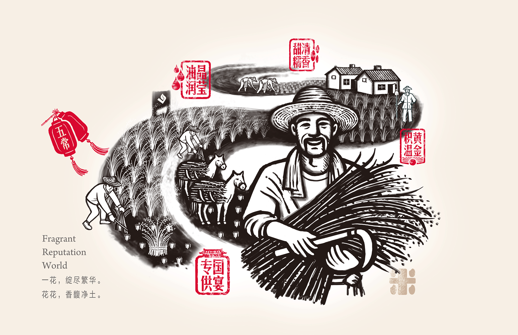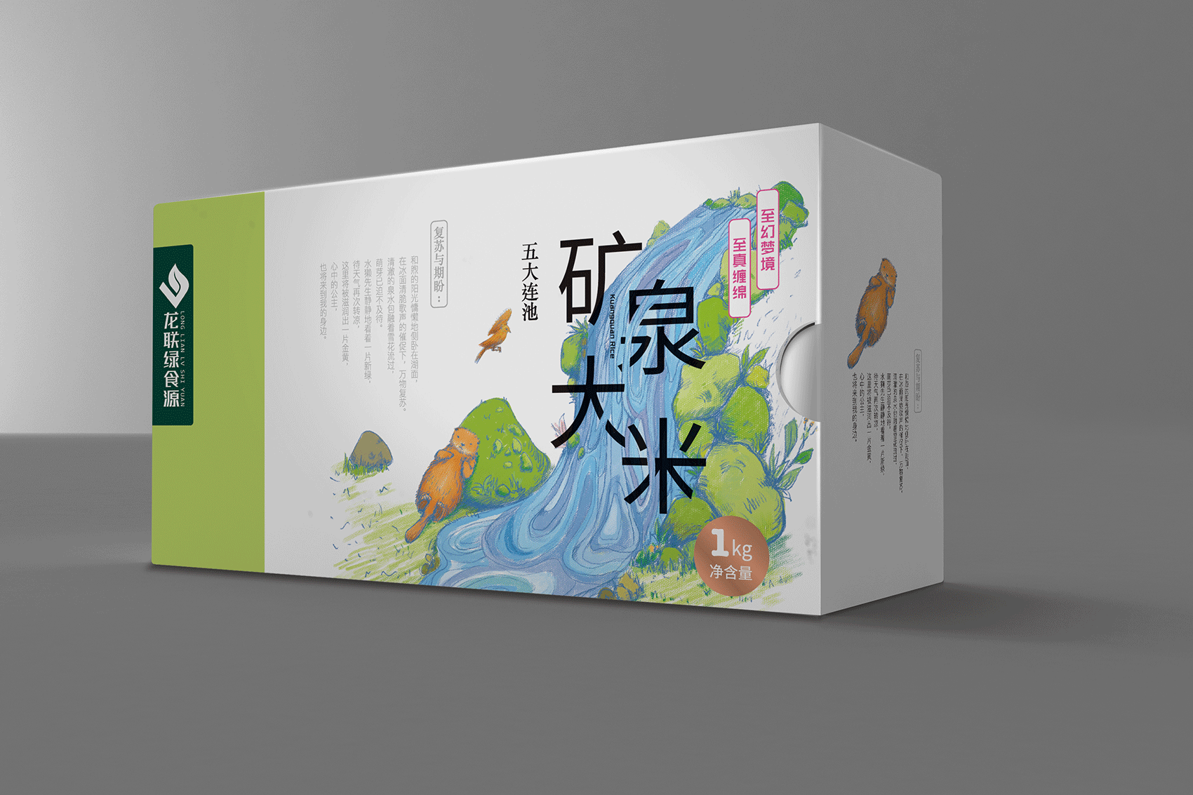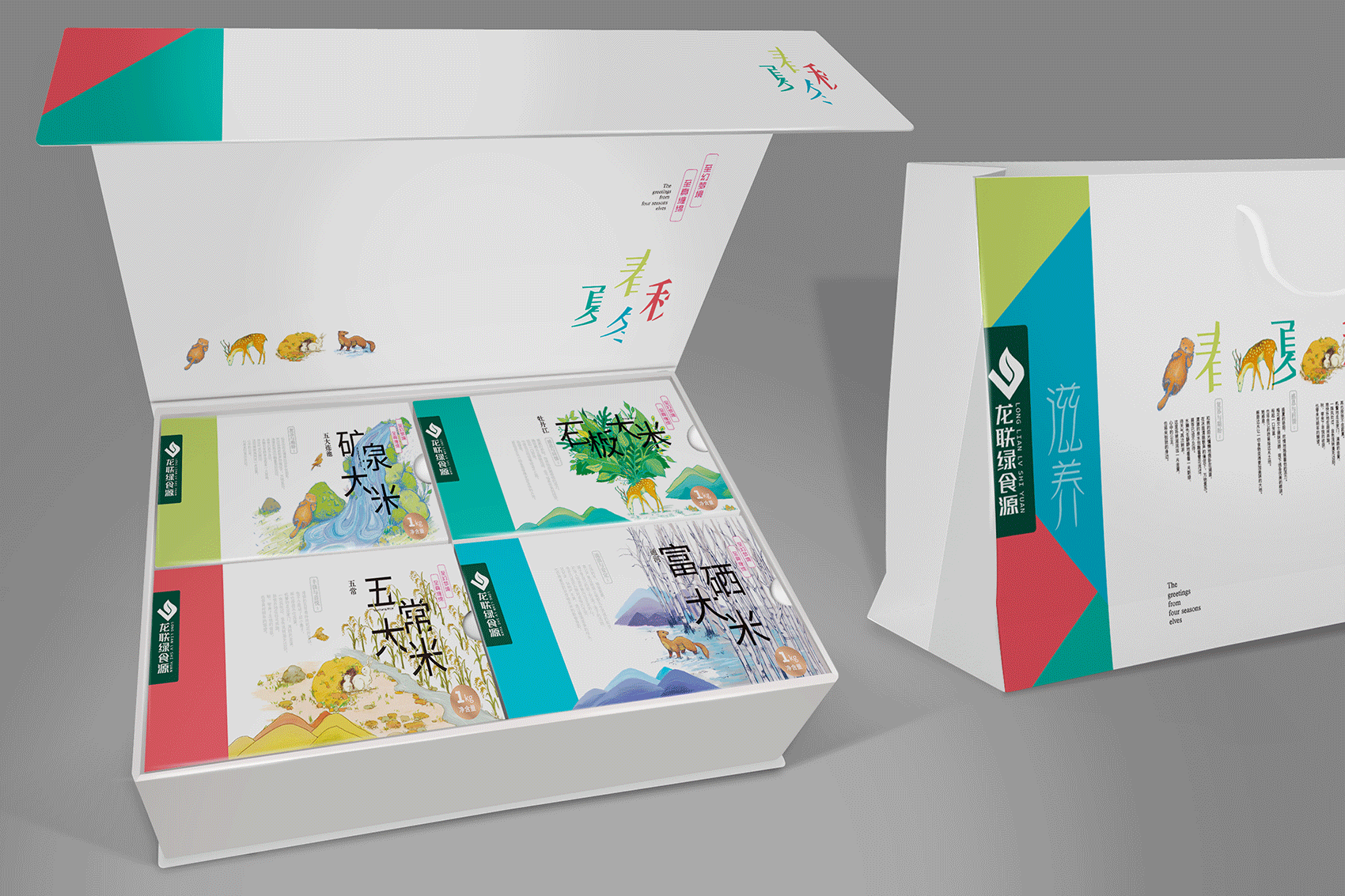 以統(tǒng)一的包裝材質(zhì),首先向市場傳達(dá)環(huán)保、健康的時代大主題。 以產(chǎn)品文化(文創(chuàng))與視覺創(chuàng)意進(jìn)一步詳細(xì)地對產(chǎn)品優(yōu)勢概念進(jìn)行闡述,最大地突出產(chǎn)品的核心優(yōu)勢特征,并衍生出數(shù)個產(chǎn)品優(yōu)勢概念,有層次、分主次地將內(nèi)容豐富產(chǎn)品概念傳達(dá)給市場,促進(jìn)市場消費欲望,達(dá)成吸引關(guān)注與促單的最終目的。以四個獨立的環(huán)保白卡紙包裝,以講述產(chǎn)品故事的形式,將四個米種的優(yōu)勢特征展現(xiàn)給消費者,務(wù)求內(nèi)包裝表現(xiàn)風(fēng)格與禮盒的和諧統(tǒng)一,彌補大包裝無法表述全部細(xì)節(jié)的劣勢。