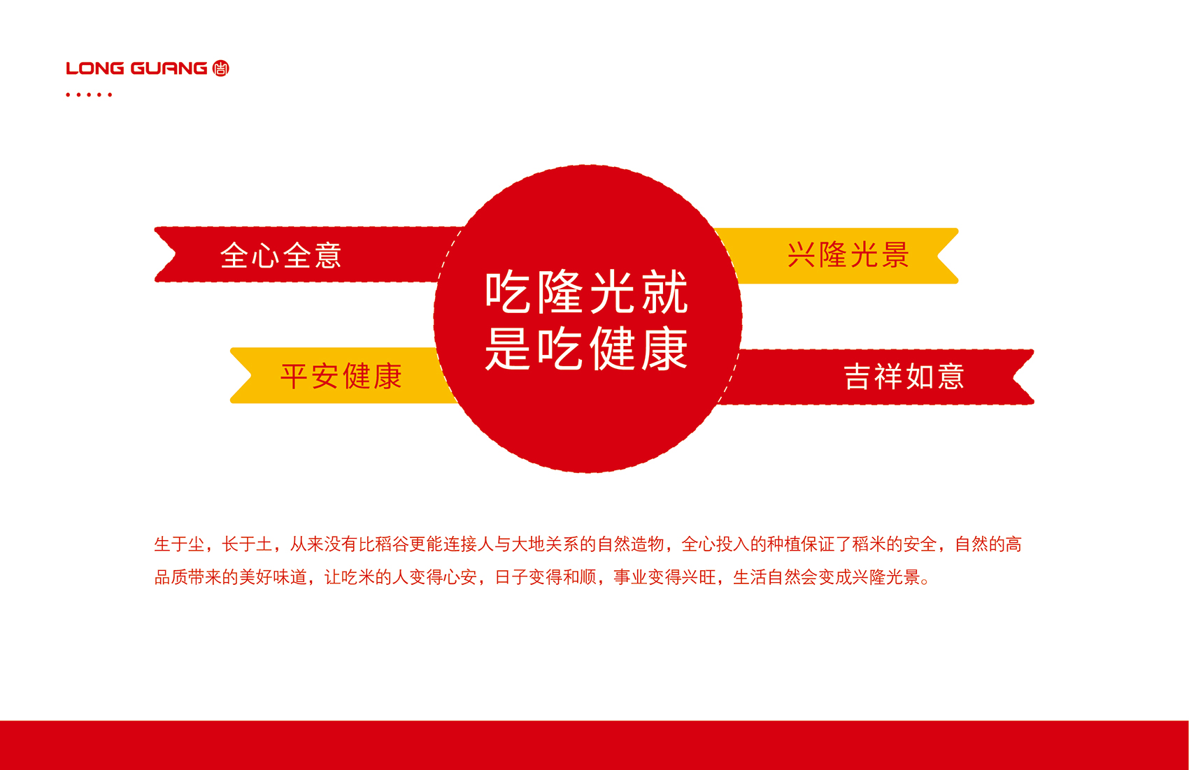 品牌文化從隆光=放心為出發(fā)點(diǎn),以品牌定位為核心,逐層遞進(jìn)不斷詮釋隆光大米=放心糧的品牌占位,總結(jié)出吃隆光,放心糧的slogan,并歸納出“興隆光景、吉祥如意、全心全意、平安健康”四個(gè)品牌核心價(jià)值,將企業(yè)的匠心精神與產(chǎn)品品質(zhì)進(jìn)行了梳理論證,全方位闡釋隆光大米的高品質(zhì),打造與同類市場相區(qū)隔的品牌印象。