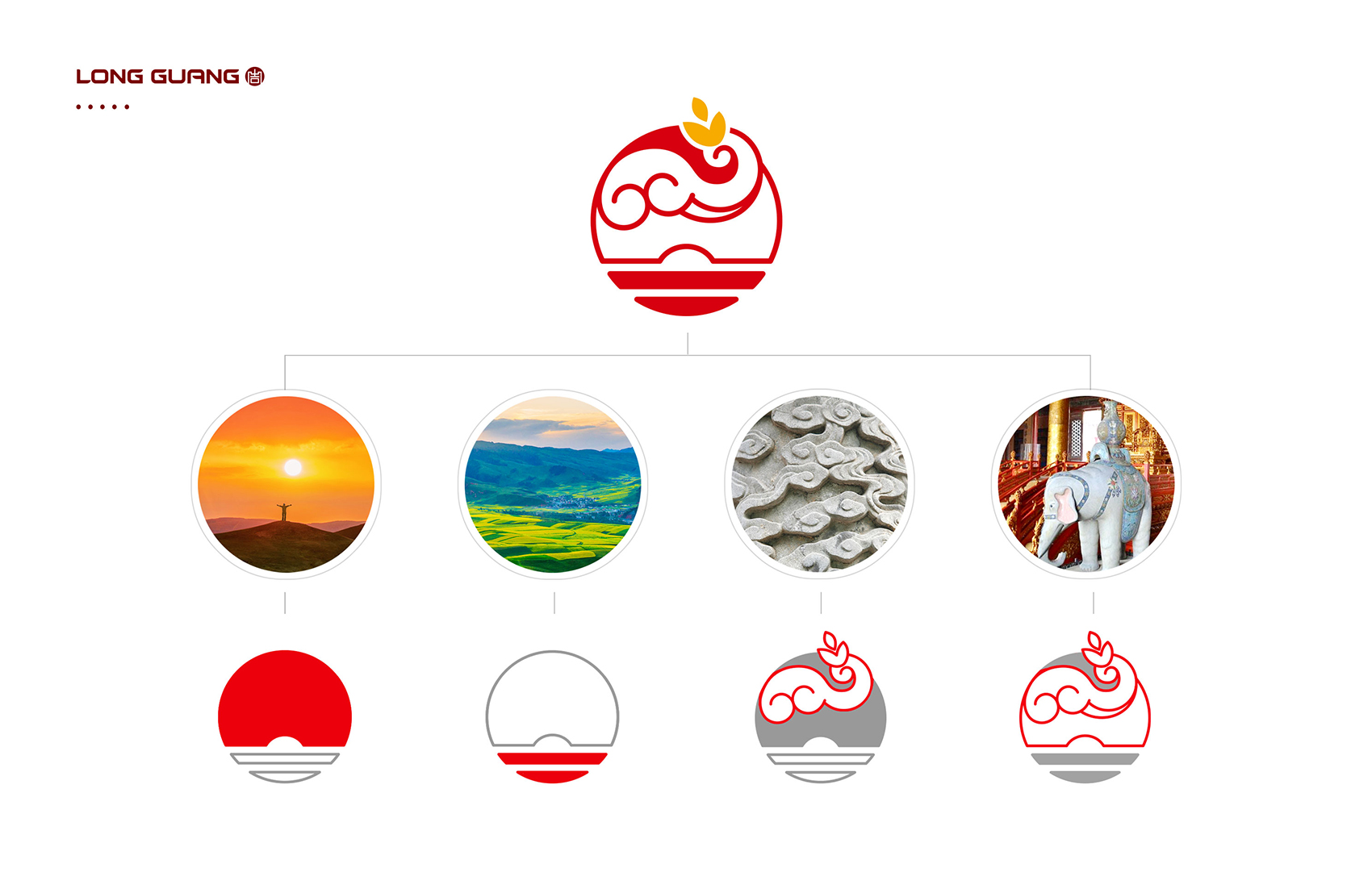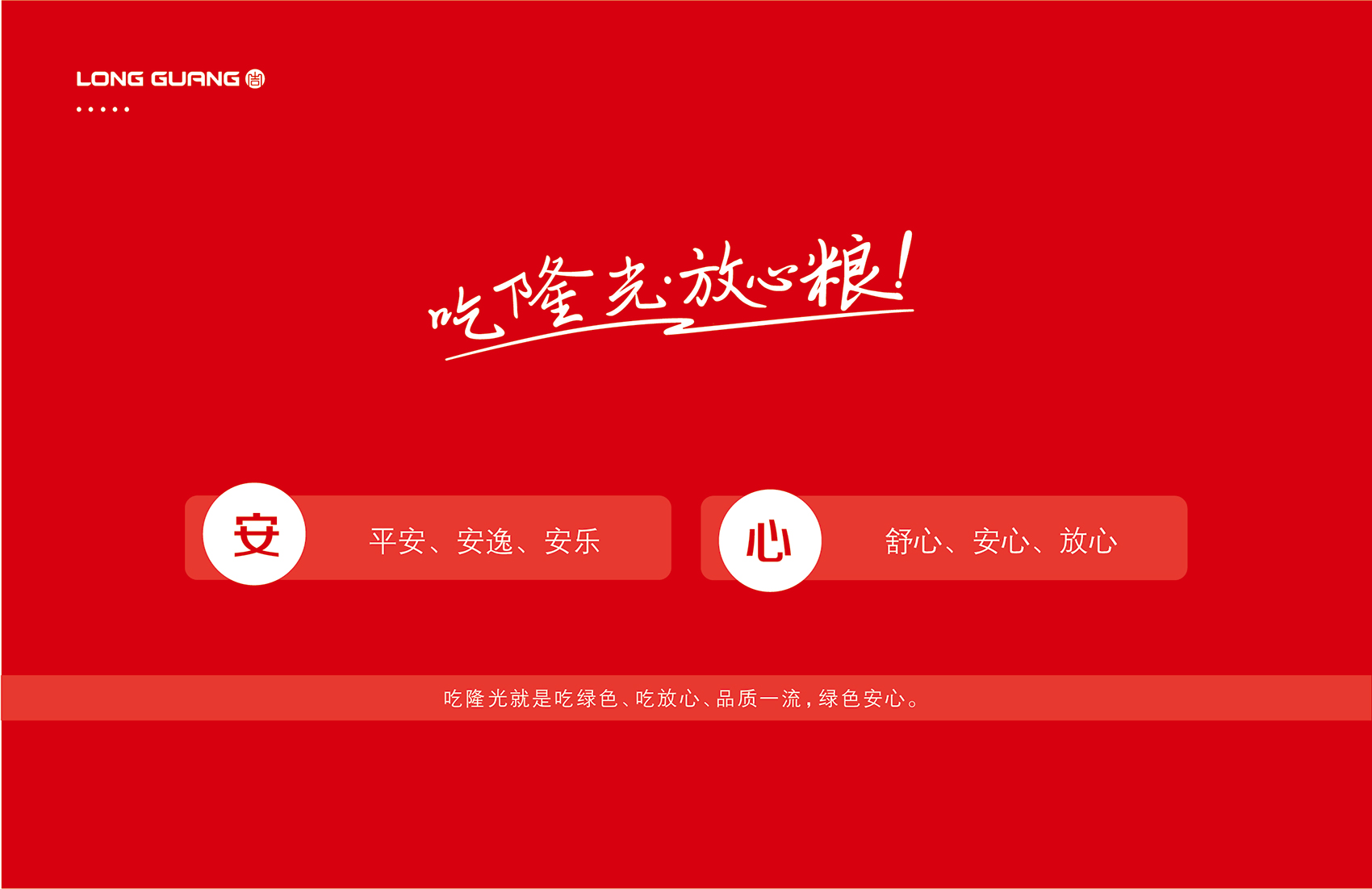 結(jié)合隆光大米處于品牌初創(chuàng)期的實(shí)際情況,突破同質(zhì)化的同時(shí)要拓展市場,在不做過多的廣宣的情況下,一個(gè)美觀大方、易于傳播的超級符號是解決這一問題的關(guān)鍵。經(jīng)過頭腦風(fēng)暴后,繽策通過品牌名稱——隆光兩字溯源,了解到隆字有興隆、厚重之意,而光字代表光明,昌盛,兩字合二為一意為吉祥安康,產(chǎn)品為有機(jī)稻花香,高品質(zhì)的好米自然會為消費(fèi)者帶來美好的生活,美好生活自然讓人放心,所以隆光=安康=放心成為了隆光的品牌內(nèi)在價(jià)值邏輯。