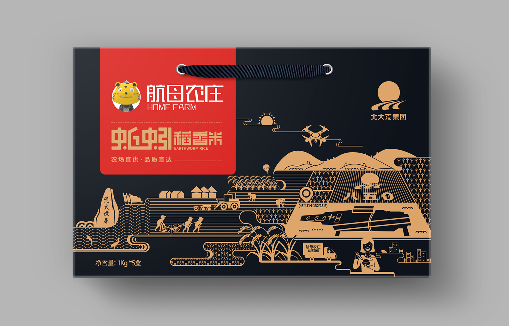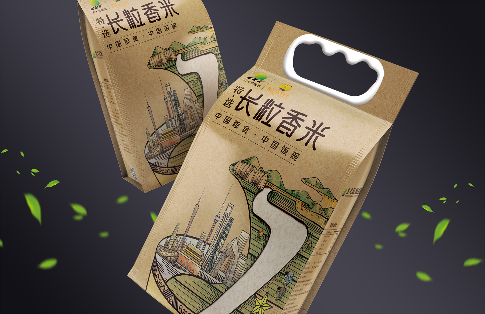 長粒香種植區(qū)位于七星農(nóng)場,在習(xí)近平總書記考察后發(fā)表了著名的中國飯碗中國糧的講話,“北大荒為中國人真正解決溫飽問題發(fā)揮了大作用,我們一定要保護好黑土地,保護好中國飯碗。中國人要把飯碗端在自己手里,而且要裝自己的糧食?!崩_策采用類版畫風格的插畫來表現(xiàn)從農(nóng)場直接到飯碗中的品牌核心價值,優(yōu)質(zhì)的綠水青山自然環(huán)境之下生產(chǎn)出高品質(zhì)好滋味的長粒香,中間的鏤空部分既象征著產(chǎn)品的產(chǎn)地——七星農(nóng)場,也象征著運送產(chǎn)品的廣闊道路,形成令人記憶深刻的超級符號;在碗中的地標性建筑物代表全國各地,寓意企業(yè)寬廣美好的未來;整體包材采用環(huán)保牛皮紙,在提升了質(zhì)感與手感的同時,也能在同質(zhì)化的包裝中脫穎而出。