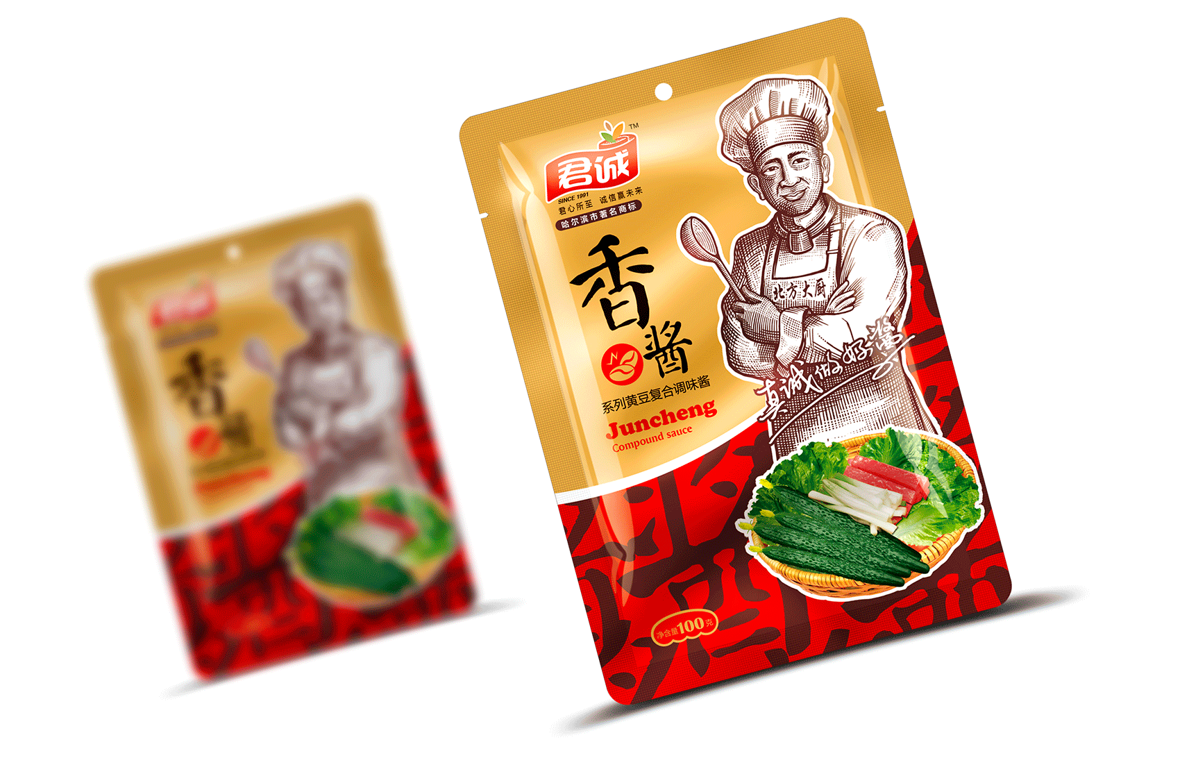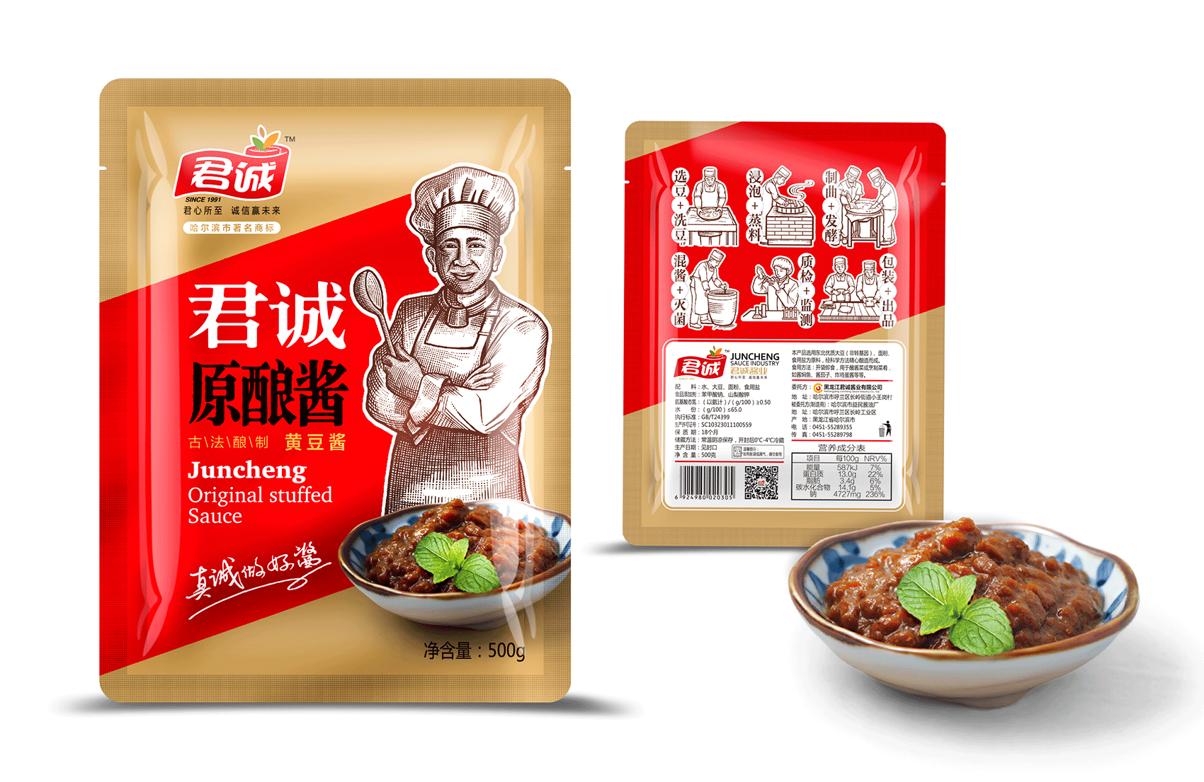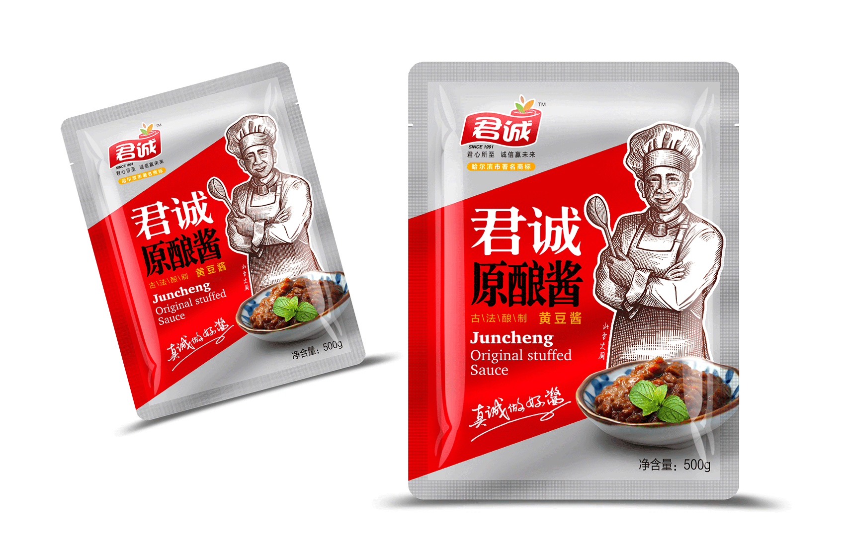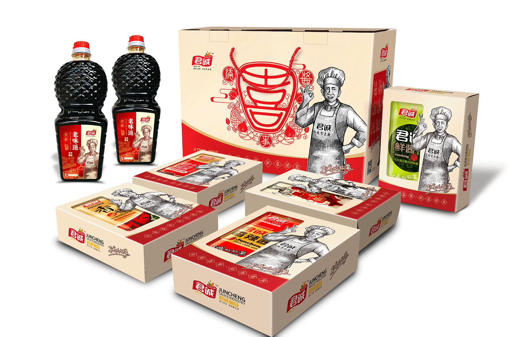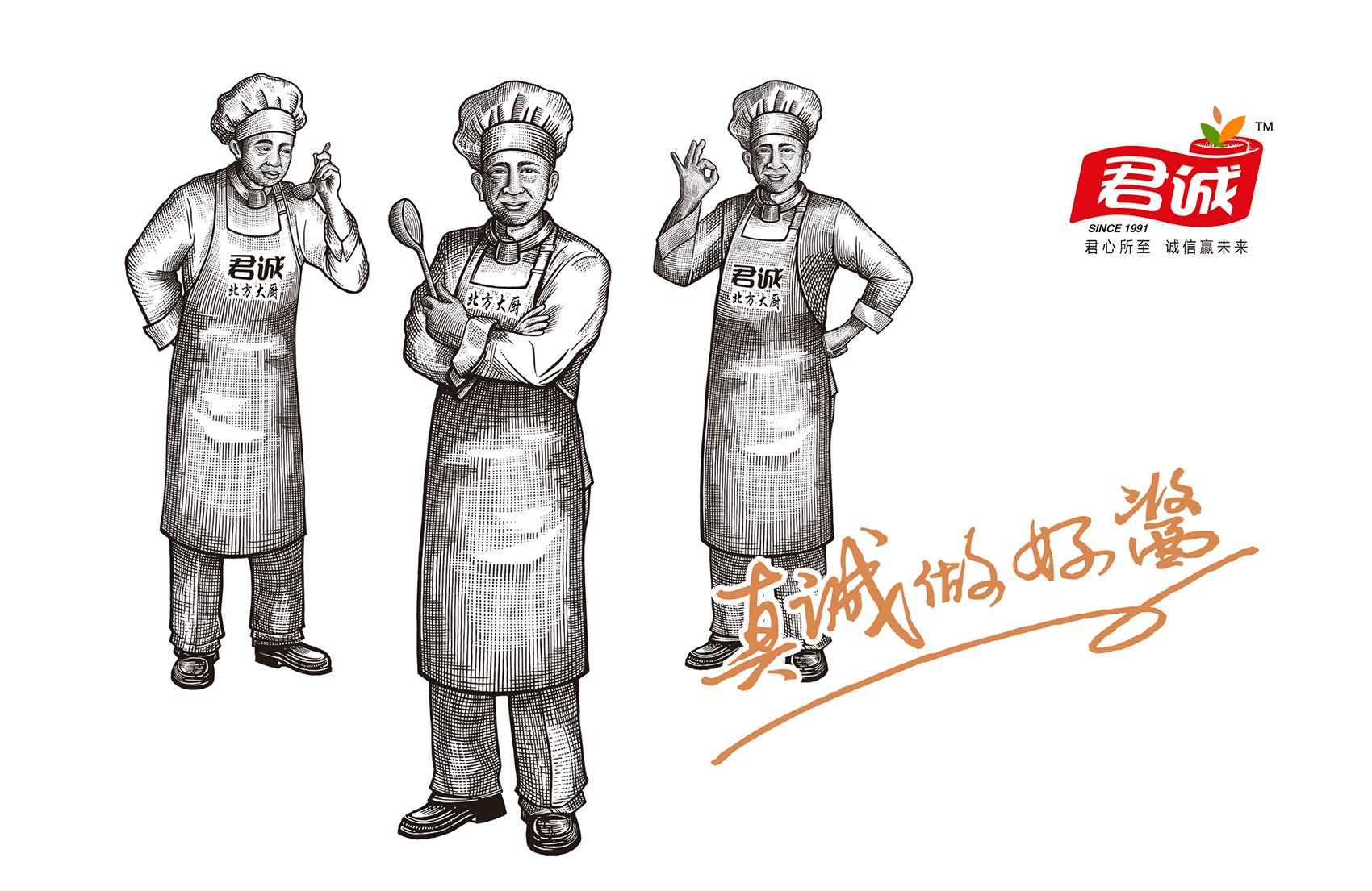 君誠(chéng)醬以原釀醬為出發(fā)點(diǎn),潛心研制釀造工藝,味道更鮮香,滋味更醇厚,適合北方人口味的醬料系列,品質(zhì)的保證是品牌能夠植入心智的第一步,這同時(shí)也是君誠(chéng)醬與其他醬料最大的差異化賣(mài)點(diǎn)——真心實(shí)意,真材實(shí)料,于是產(chǎn)品的廣告語(yǔ)自然而然脫口而出——真誠(chéng)做好醬;接下來(lái)就是如何通過(guò)視覺(jué)化符號(hào)最大程度最有效率的將君誠(chéng)醬的優(yōu)勢(shì)傳遞給消費(fèi)者,繽策經(jīng)過(guò)頭腦風(fēng)暴后想到了深入人心的超級(jí)符號(hào)——北方大廚。