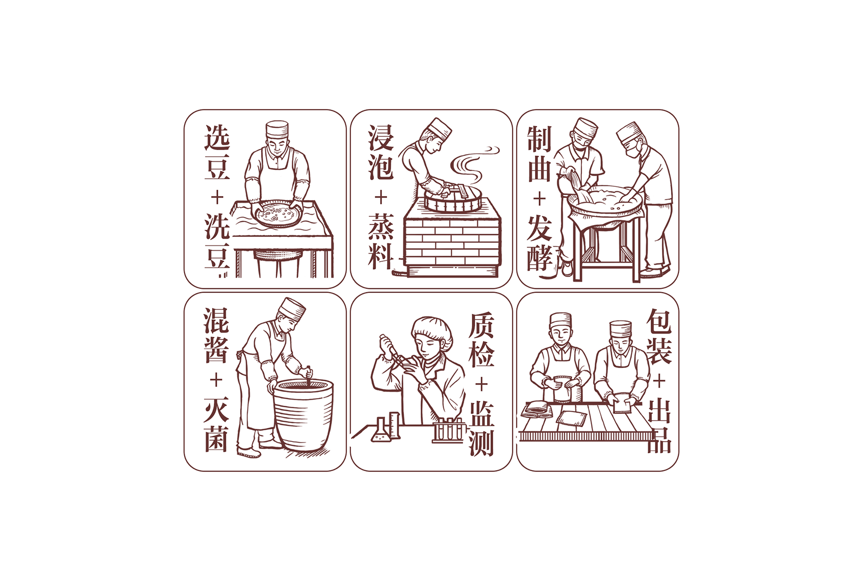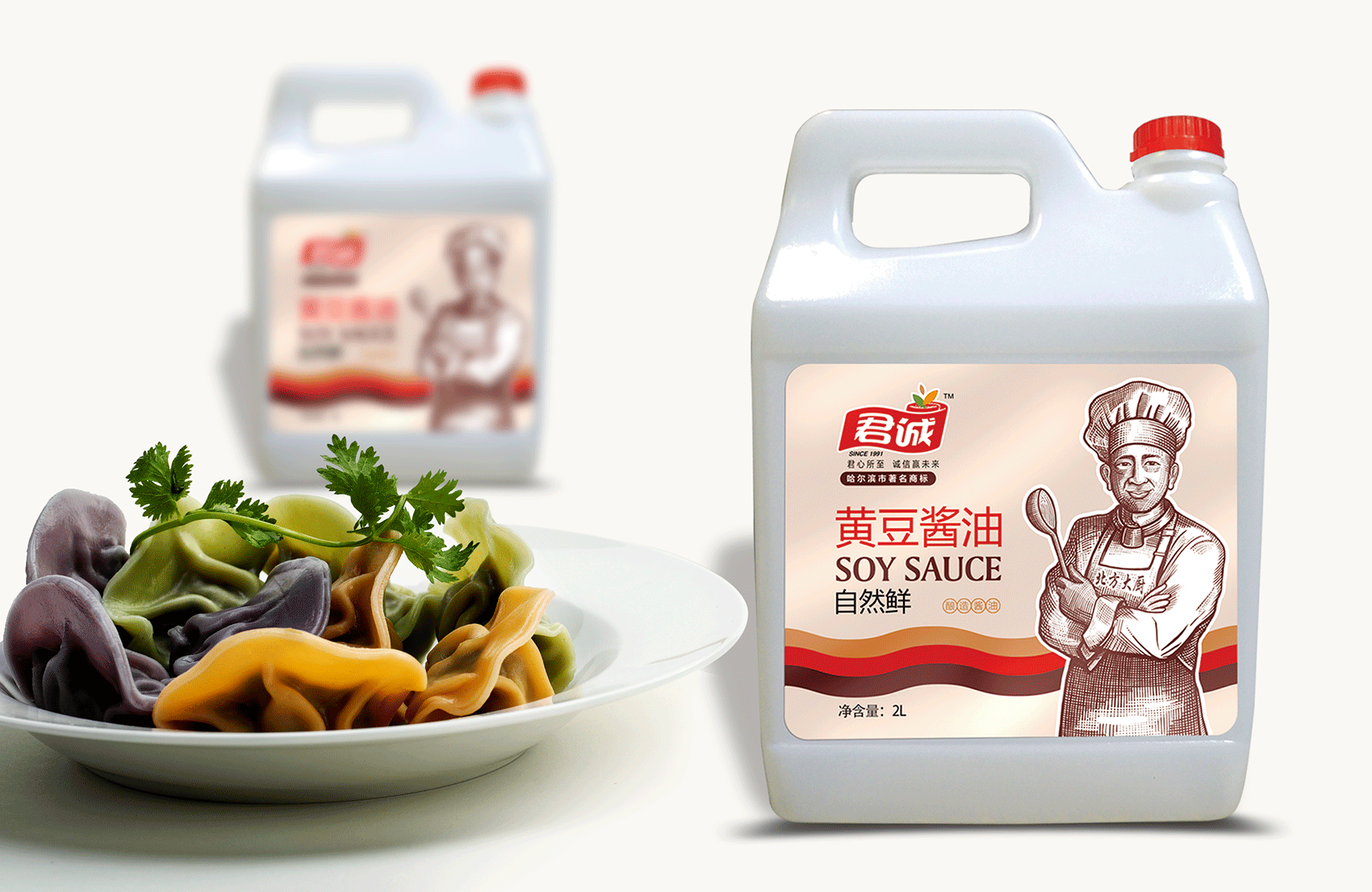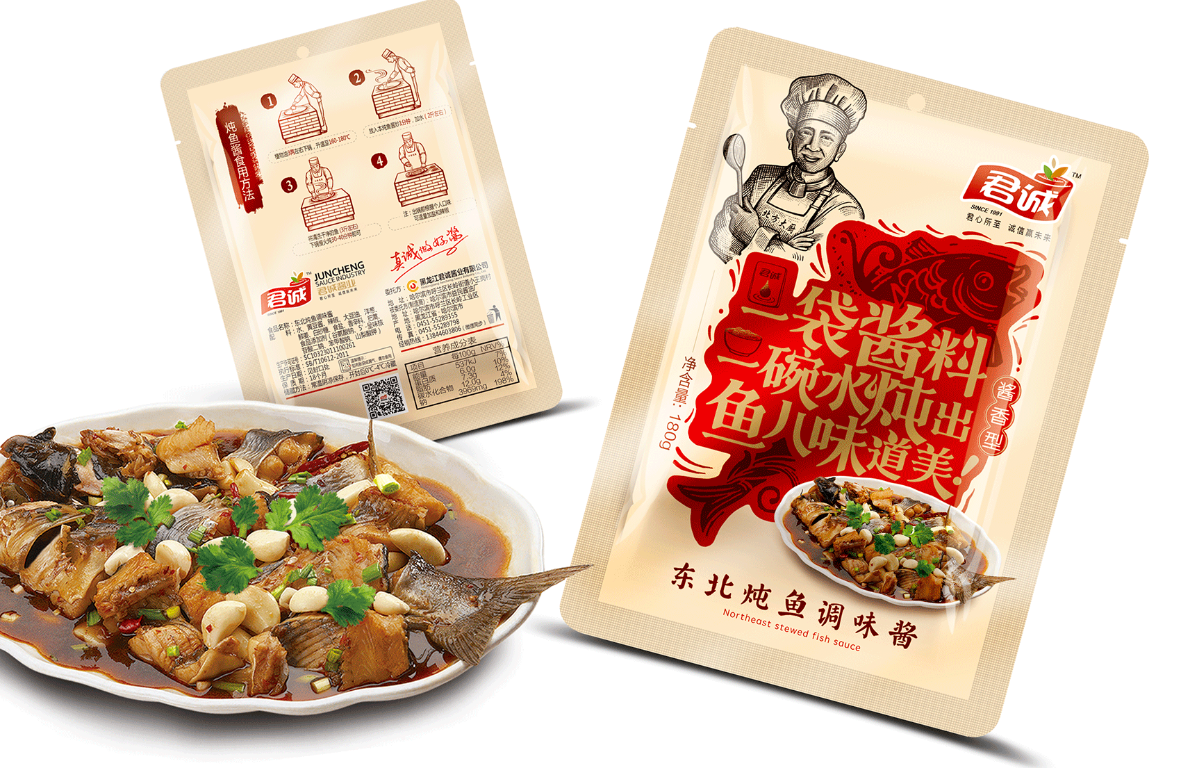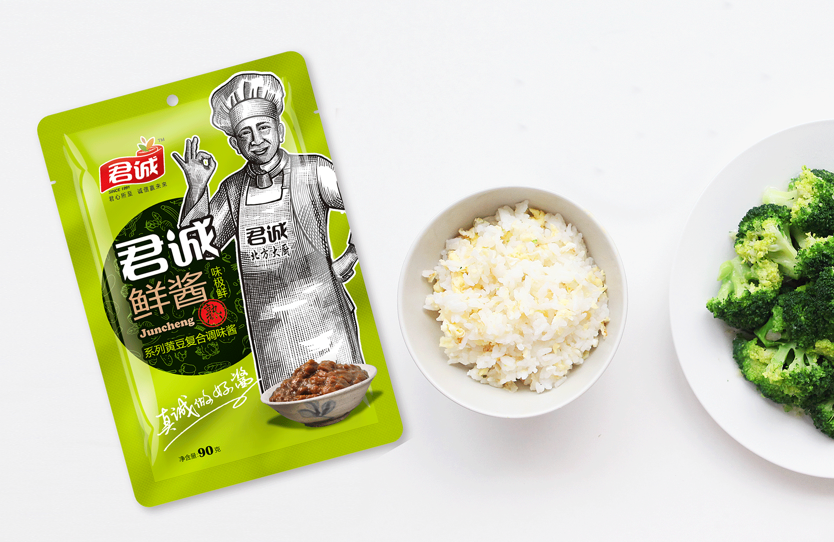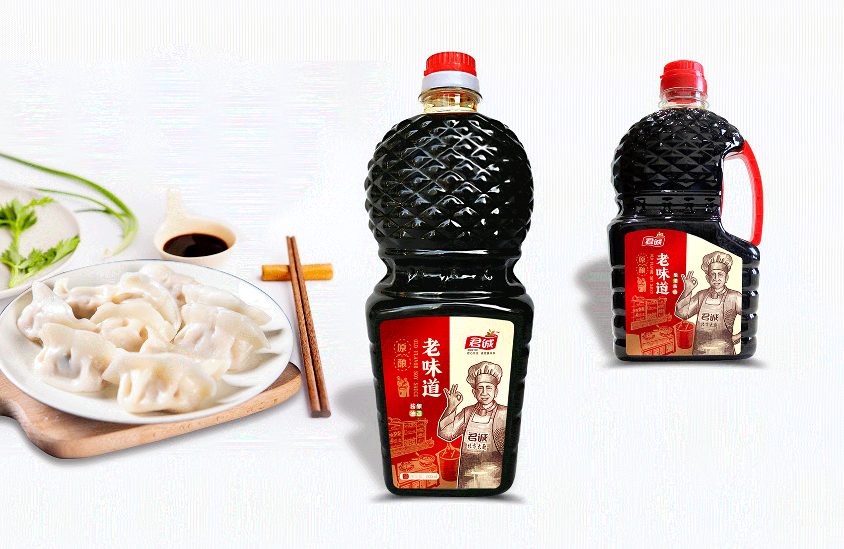 君誠(chéng)醬以原釀醬為出發(fā)點(diǎn),潛心研制釀造工藝,味道更鮮香,滋味更醇厚,適合北方人口味的醬料系列,品質(zhì)的保證是品牌能夠植入心智的第一步,這同時(shí)也是君誠(chéng)醬與其他醬料最大的差異化賣(mài)點(diǎn)——真心實(shí)意,真材實(shí)料,于是產(chǎn)品的廣告語(yǔ)自然而然脫口而出——真誠(chéng)做好醬;接下來(lái)就是如何通過(guò)視覺(jué)化符號(hào)最大程度最有效率的將君誠(chéng)醬的優(yōu)勢(shì)傳遞給消費(fèi)者,繽策經(jīng)過(guò)頭腦風(fēng)暴后想到了深入人心的超級(jí)符號(hào)——北方大廚。