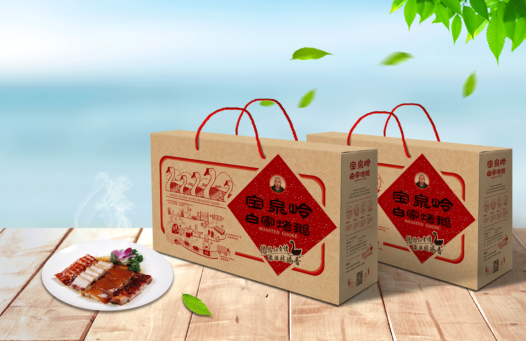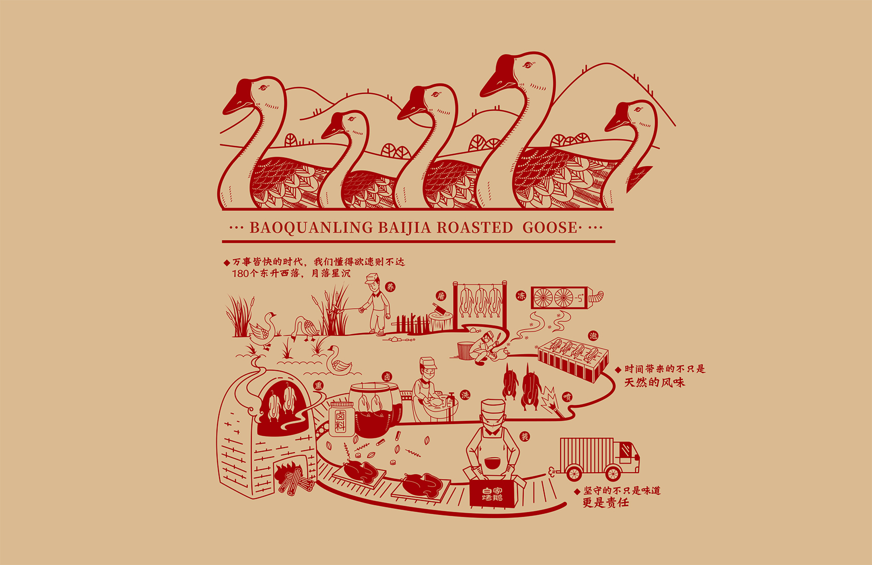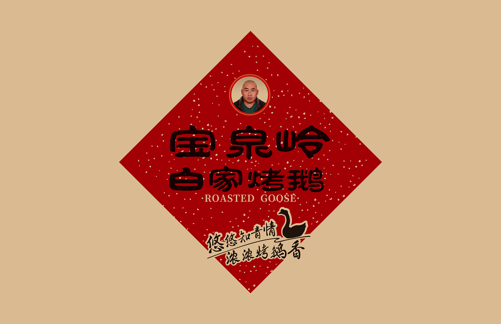 以真實形象示人代表敢為產(chǎn)品與品牌負責,白家烤鵝的LOGO選擇以創(chuàng)始人的照片進行注冊本身就代表了一種承諾,結合知青群體的審美,繽策將“寶泉嶺白家烤鵝”與標志組合成一個喜慶的中式春聯(lián)的吉祥圖案,通過中式春聯(lián)的傳統(tǒng)符號將寶泉嶺白家烤鵝植入到消費者心智,形成喜慶紅火,佳節(jié)伴手禮的品牌印象;字體使用原創(chuàng)設計字體,參考傳統(tǒng)隸書的書法風格,方勁古拙,厚重可靠,其中的“嶺”字右半部分經(jīng)過整合,形似“合”字代表了品牌對于消費者的美好祝愿與對于烤鵝事業(yè)的不懈努力的目標愿景。