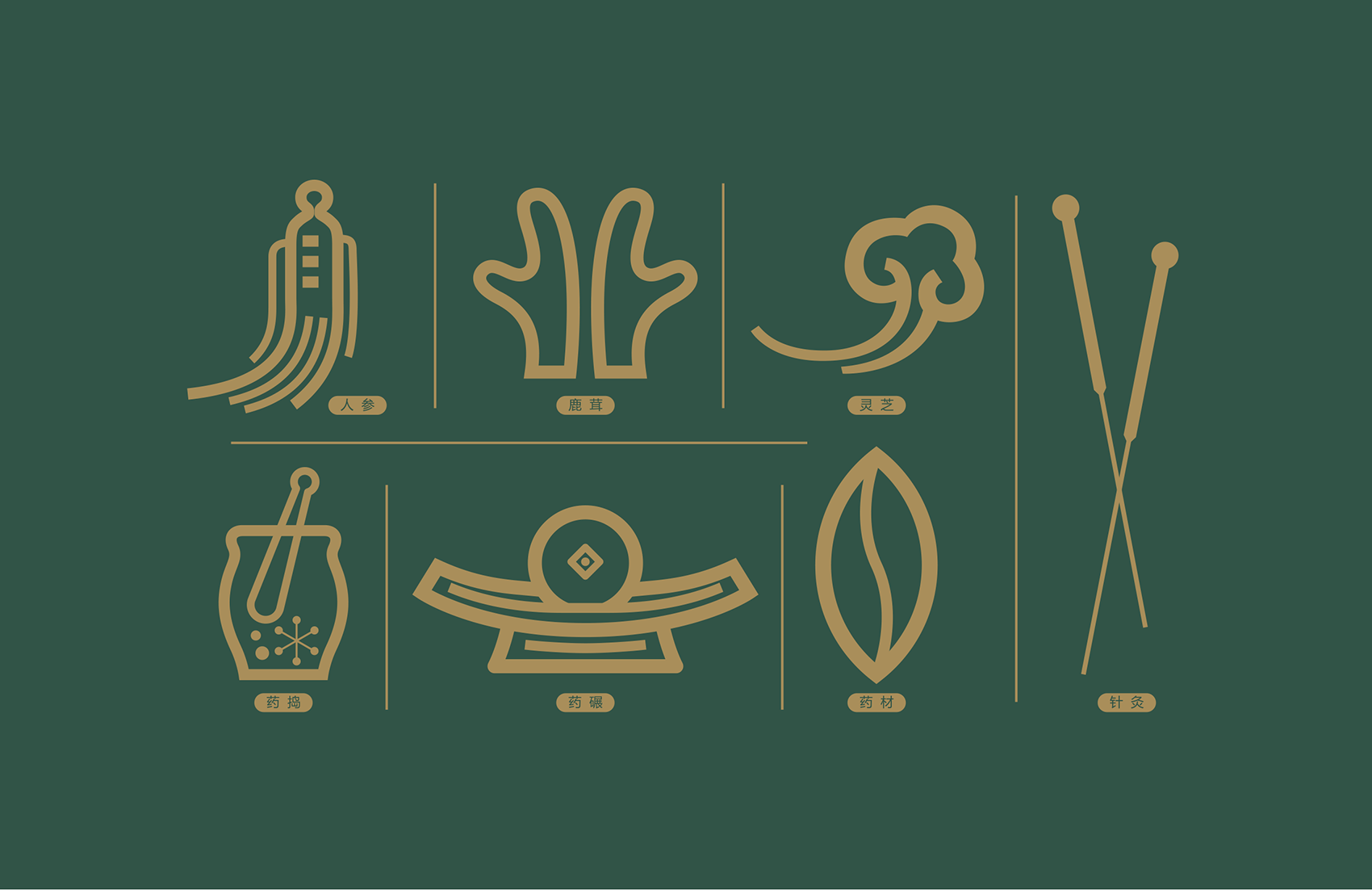 至于品牌輔助圖形,繽策規(guī)劃出靈芝、銀針、藥杵等七種中醫(yī)領(lǐng)域最常見、最具代表性的物品,加之品牌形象共計(jì)八種形態(tài),以暗合八卦的一一對(duì)應(yīng)。